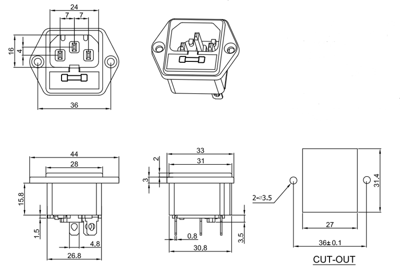 治具插座S-03系列,單插、二合一、三合一保險插座等多種規(guī)格,大電流10A ,15A,產品通過UL VDE CCC CB等認證,常見于家用電器,音響功放機等